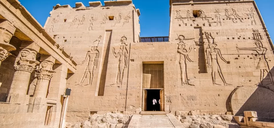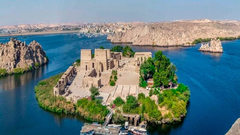 Philae Temple: Dedicated to the goddess Isis, this temple narrates a famous story from Egyptian mythology about Isis bringing her husband back to life, the birth of their son Horus, and the mummification of Osiris. Originally built during Ptolemy II's reign in Egypt's Greco-Roman Period, the temple was relocated to Agilika island to save it from flooding caused by the High Dam. Historically, obelisks stood in front of the temple, but these were removed by British Consul Henry Salt in 1918 and are now located in a garden in Dorset, England.