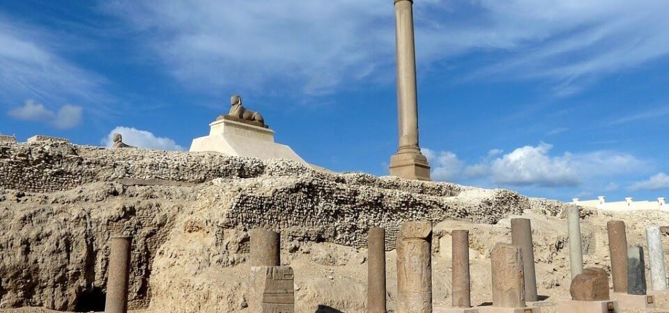 - The Pompey’s Pillar: it’s a Roman triumphal column of 25-meter high and 2.7-meter at its base which Made of red Aswan granite and was built in honor of the Roman Emperor Diocletian who freed the besieged city and brought food to its starving people and site contain also a big statue of him.